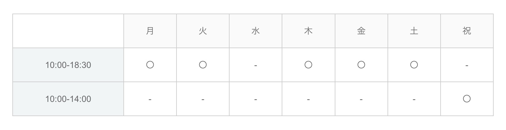 〔月曜、火曜、木曜、金曜、土曜…10:00-18:30〕