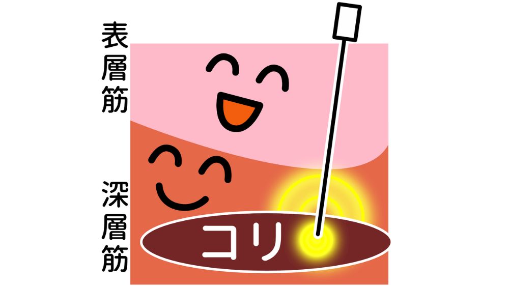 この悪循環を断ち切るには、表面のマッサージでは届かない体の深部にある筋肉に直接刺激を与える治療が必要になります。